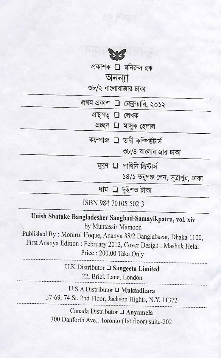 Unish Shotoke Bangladesher Shongbad Samoyik Potro-14 is a book written by Muntassir Mamoon and published by Anannya.