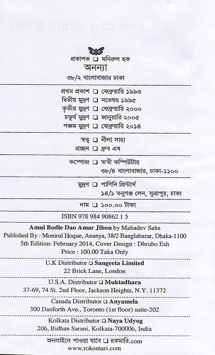 অমূল বদলে দাও আমার জীবন বইটি লিখেছেন মহাদেব সাহা। প্রকাশক অনন্যা। পৃষ্ঠার এই বইটির মূল্য 100 টাকা।