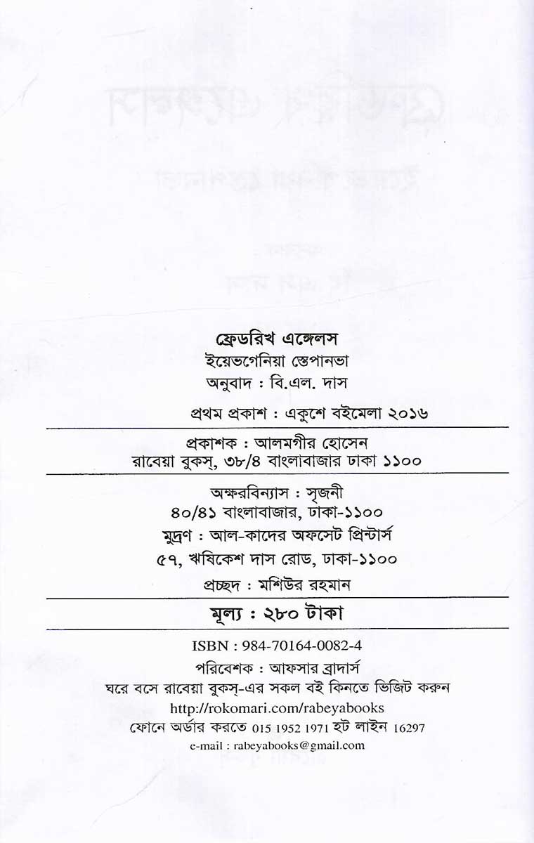 ফ্রেডরিখ এঙ্গেলস (ইয়েভগেনিয়া স্তেপানডা) বইটি লিখেছেন বি এল দাস। প্রকাশক আফসার ব্রাদার্স। 200 পৃষ্ঠার এই বইটির মূল্য 280 টাকা।