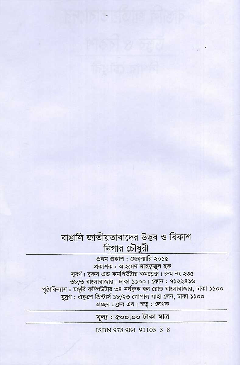 বাঙালি জাতীয়তাবাদের উদ্ভব ও বিকাশ বইটি লিখেছেন ড. নিগার চৌধুরী। প্রকাশক সুবর্ণ। 400 পৃষ্ঠার এই বইটির মূল্য 500 টাকা।