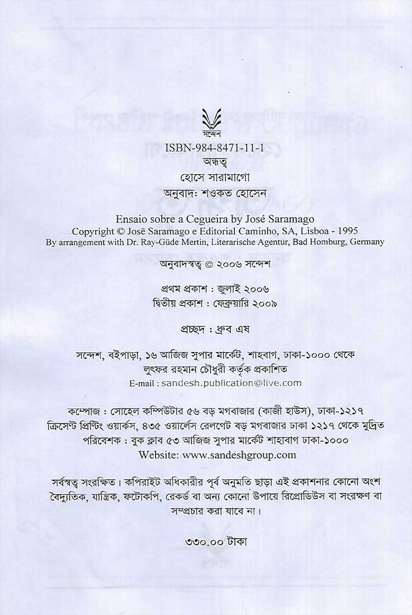 অন্ধত্ব (জোসে সারামাগো) বইটি লিখেছেন শওকত হোসেন। প্রকাশক বুক ক্লাব। 256 পৃষ্ঠার এই বইটির মূল্য 330 টাকা।