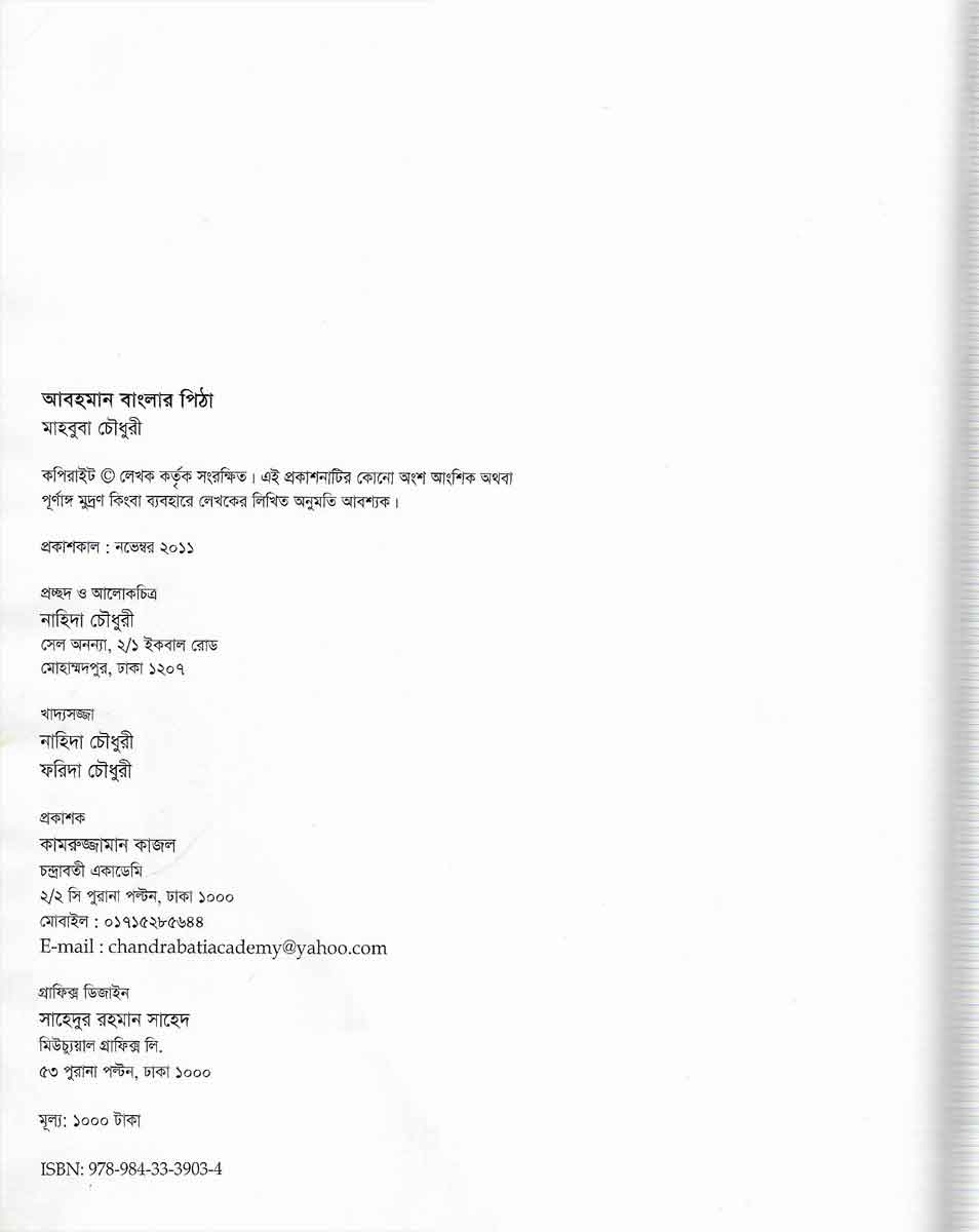 Abhoman Bangkar Pitha is a book written by Mahbuba Chowdhury and published by Chandrabati Academy.