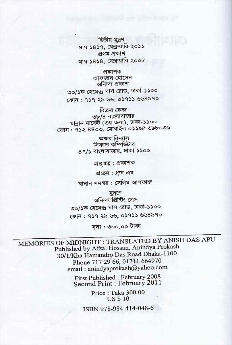 মেমোরিজ অভ মিডনাইট বইটি লিখেছেন সিডনি শেলডন। প্রকাশক অনিন্দ্য প্রকাশ। 240 পৃষ্ঠার এই বইটির মূল্য 300 টাকা।
