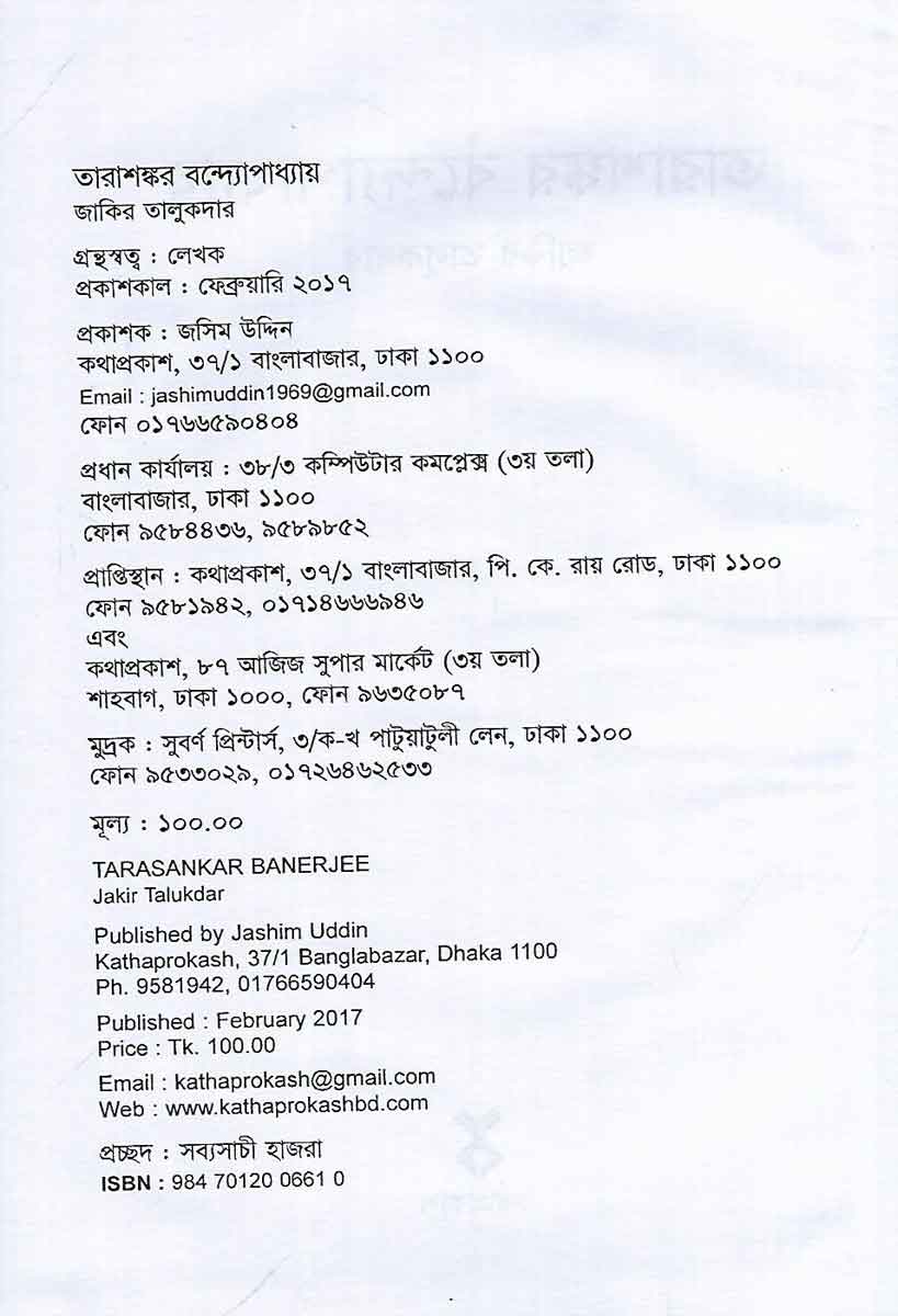 তারাশঙ্কর বন্দ্যোপাধ্যায় বইটি লিখেছেন জাকির তালুকদার। প্রকাশক কথা প্রকাশ। 96 পৃষ্ঠার এই বইটির মূল্য 100 টাকা।