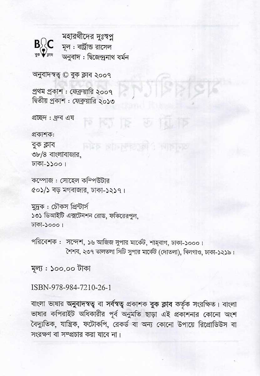 মহারথীদের দুঃস্বপ্ন (বারট্রান্ড রাসেল) বইটি লিখেছেন দ্বিজেন্দ্রনাথ বর্মন। প্রকাশক বুক ক্লাব। 80 পৃষ্ঠার এই বইটির মূল্য 100 টাকা।