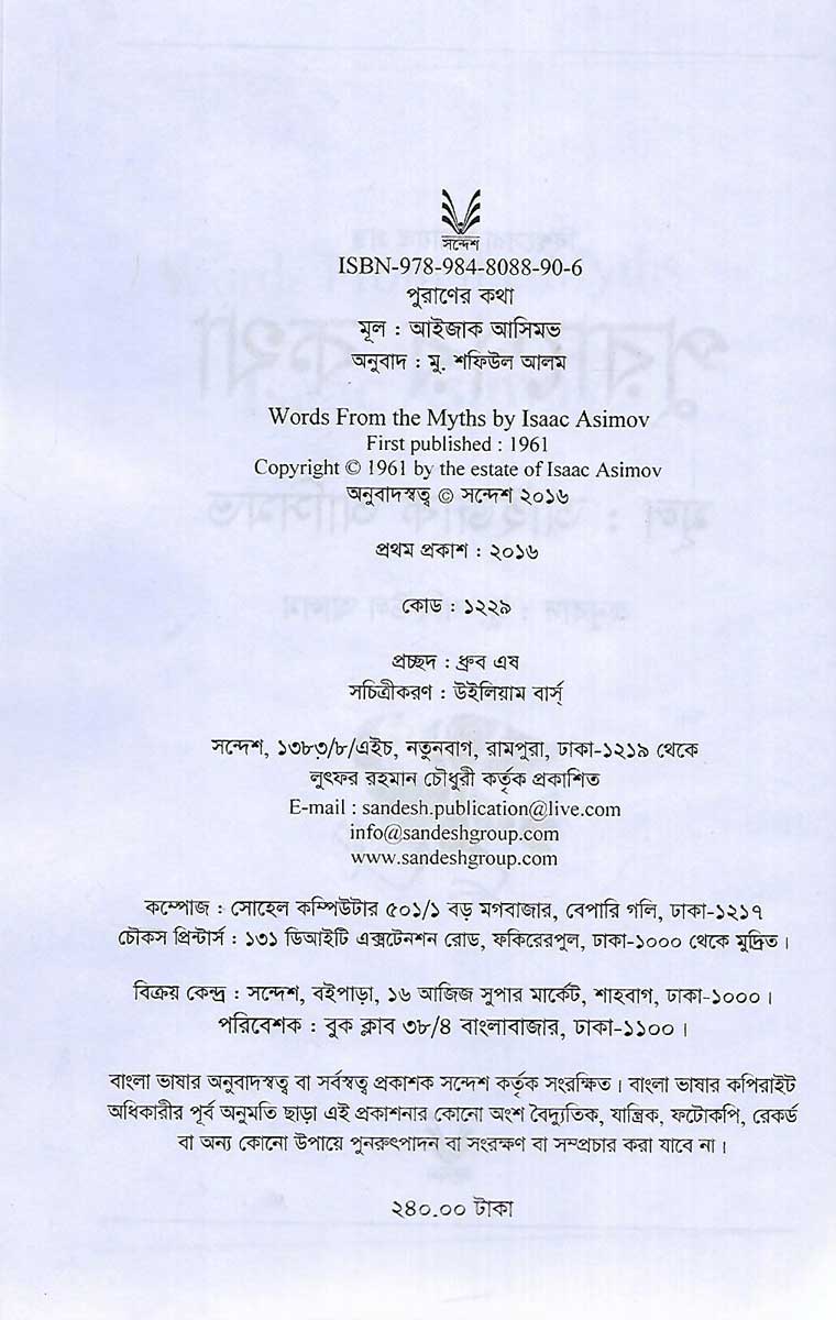 পুরাণের কথা বইটি লিখেছেন আইজাক আজিমভ। প্রকাশক বুক ক্লাব। 144 পৃষ্ঠার এই বইটির মূল্য 240 টাকা।