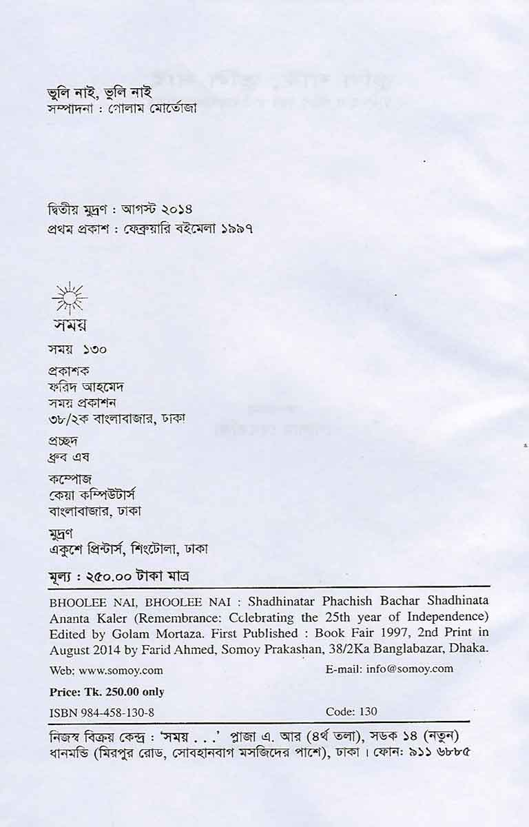 ভুলি নাই ভুলি নাই বইটি লিখেছেন গোলাম মোর্তোজা। প্রকাশক সময় প্রকাশন। 208 পৃষ্ঠার এই বইটির মূল্য 250 টাকা।