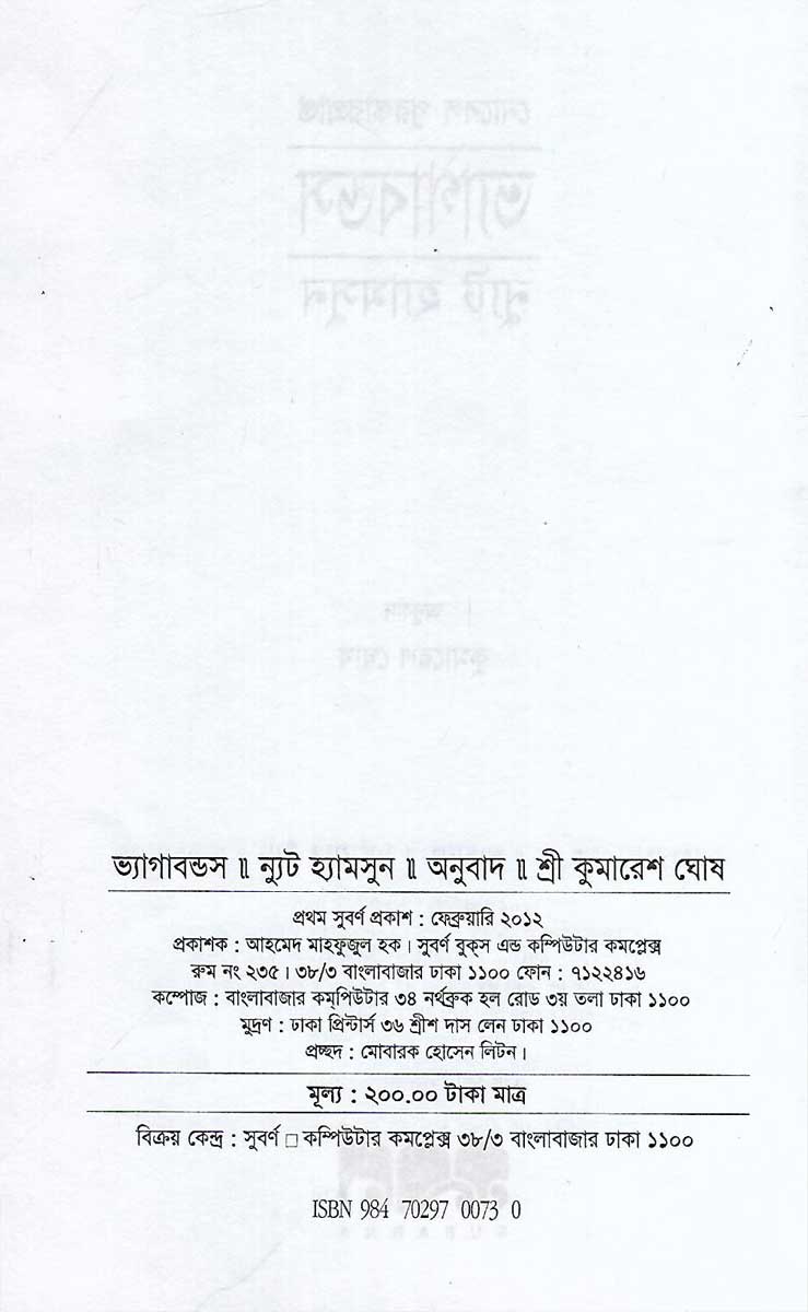ভ্যাগাবন্ডস (ন্যুট হ্যামসুন) বইটি লিখেছেন শ্রী কুমারেশ ঘোষ। প্রকাশক সুবর্ণ। 144 পৃষ্ঠার এই বইটির মূল্য 200 টাকা।
