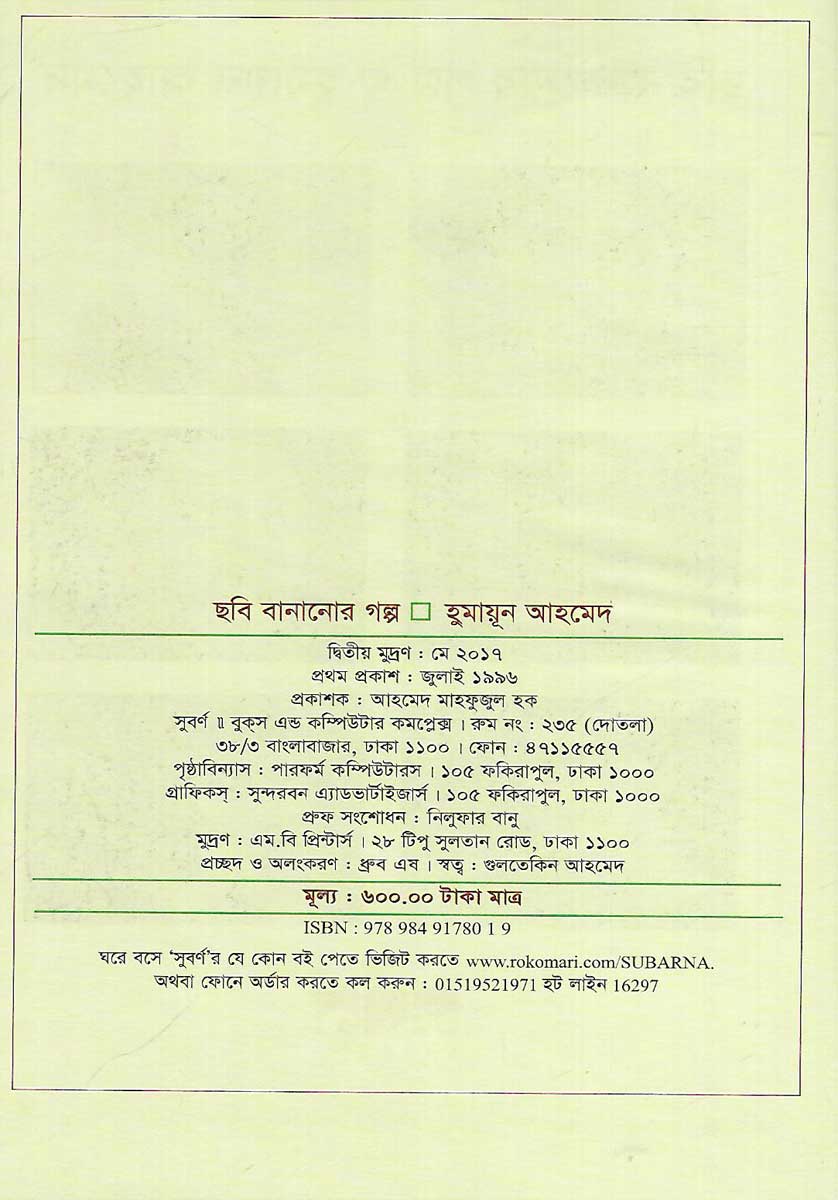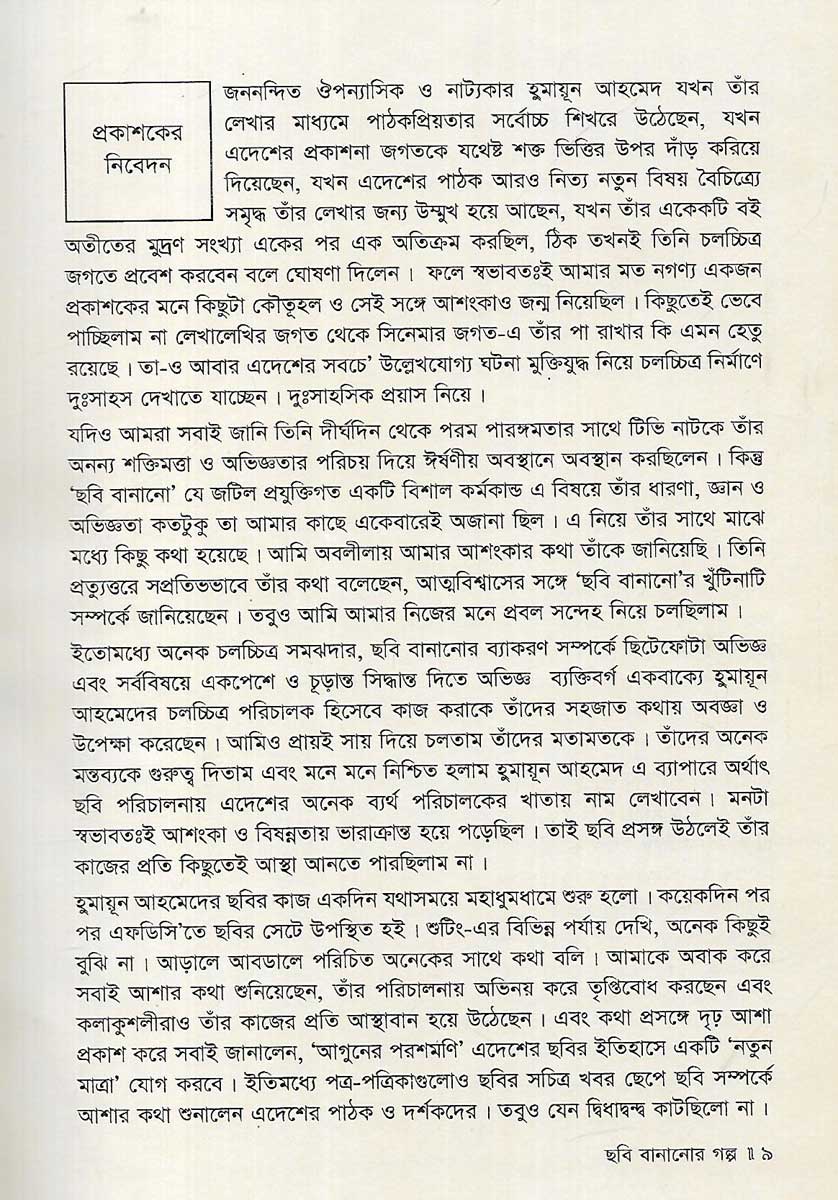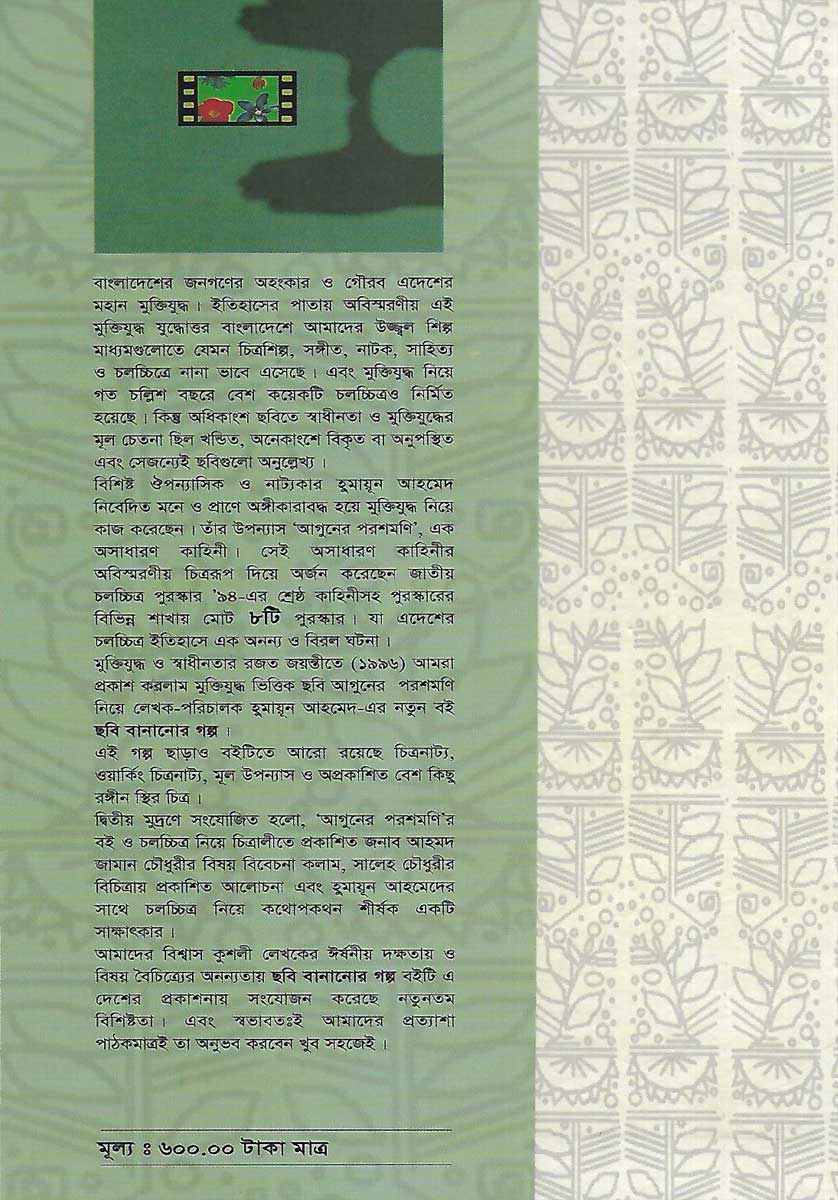 ছবি বানানোর গল্প বইটি লিখেছেন হুমায়ূন আহমেদ। প্রকাশক সুবর্ণ। 280 পৃষ্ঠার এই বইটির মূল্য 600 টাকা।
